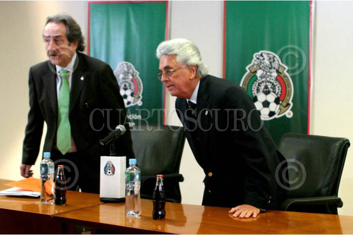 MÉXICO, D.F. 18MAYO2007.- Decio de Maria Secretario general de la Federación Mexicana de Futbol acompañado del presidente de la federación Justino Compeán al finalizar la conferencia donde anunciarón la expulsión del equipo Cruz Azul de la liguilla 2007. FOTO: SAÚL LÓPEZ/CUARTOSCURO.COM