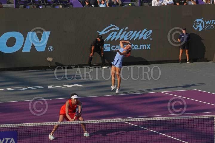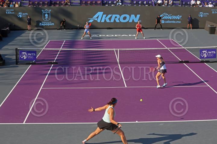 La tenistas Kaitlyn Christian Lidziya Marozava frente a las asiaticas Xinyu Wang, Lin Zhu, durante el juego correspondiente a la final de dobles, en el complejo de tenis Akron en Zapopan.