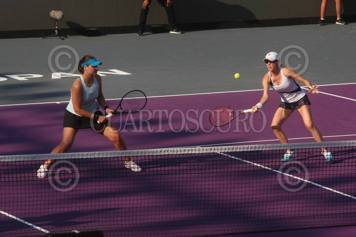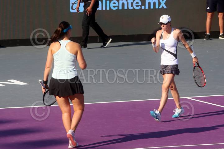 La tenistas americanas Kaitlyn Christian Lidziya Marozava, durante el juego correspondiente a la final de dobles, en el complejo de tenis Akron en Zapopan.