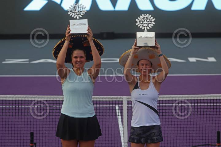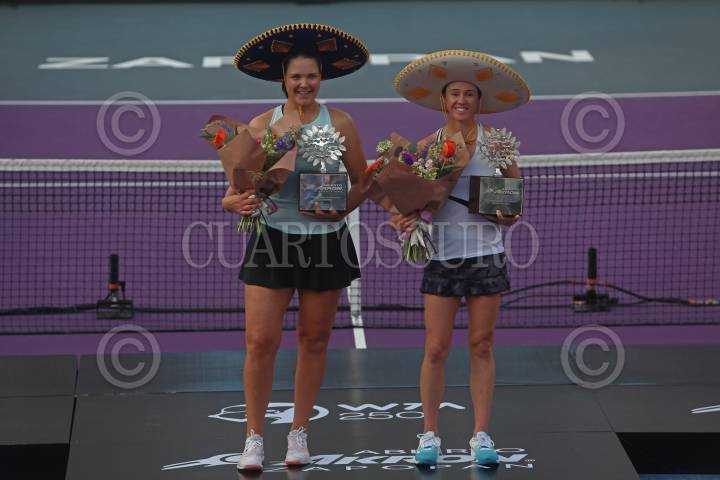 La tenistas americanas Kaitlyn Christian Lidziya Marozava, durante la premiación de la final de dobles, en el complejo de tenis Akron en Zapopan.