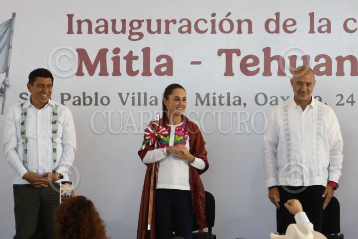 SAN PABLO VILLA DE MITLA, OAXACA, 24ENERO2025.- Salomón Jara Cruz, gobernador de Oaxaca, Claudia Sheinbaum, presidenta de México, y Jesús Antonio Esteva Medina, secretaario de Infraestructura, Comunicaciones y Transportes, durante la inauguración de la carretera “Mitla-Tehuantepec. El proyecto tiene una longitud de 169.2 kilómetros y conecta a la comunidad de Salina Cruz con la capital del estado con un tiempo de 2 horas y media, en contraste con las seis y hasta ocho horas que se hacen por la actual carretera federal 190. FOTO: CAROLINA JIMÉNEZ/CUARTOSCURO.COM