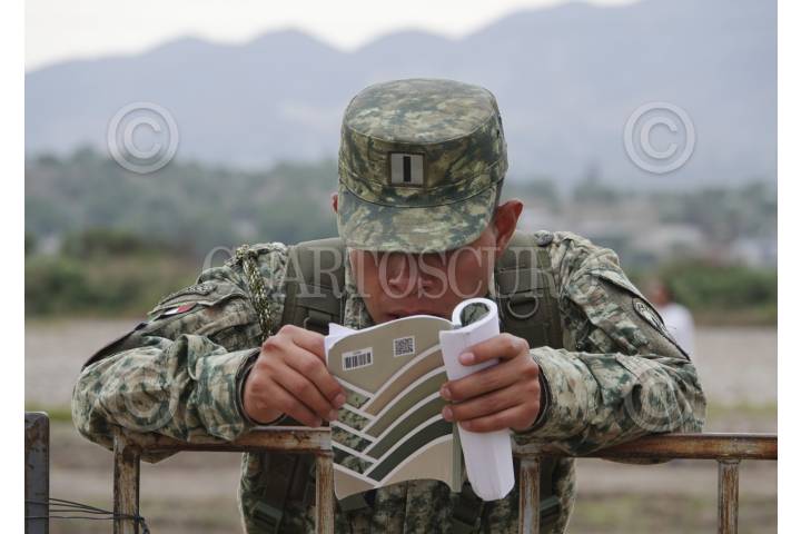 JAGUEY DE TÉLLEZ, ZEMPOALA, HIDALGO, 22MARZO2025.-- Un militar hojea una cuadernillo previo al banderazo de inicio de las obras del Tren México-Pachuca en Jaguey de Téllez, Zempoala Hidalgo, encabezado por la presidenta Claudia Sheinbaum. El proyecto busca mejorar la conectividad entre la Ciudad de Mexico e Hidalgo. FOTO: MAGDALENA MONTIEL/CUARTOSCURO.COM