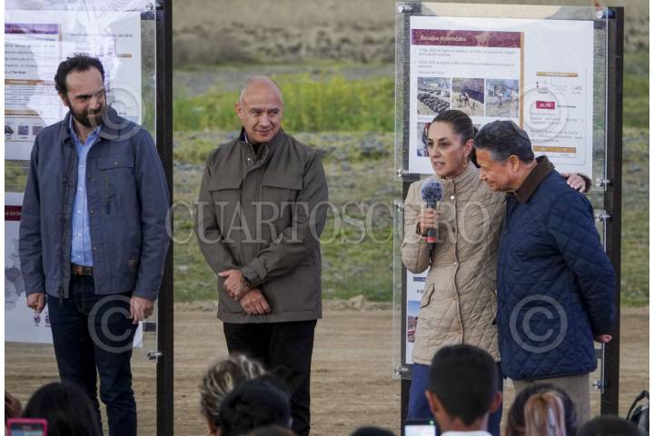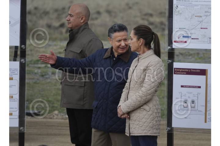 JAGUEY DE TÉLLEZ, ZEMPOALA, HIDALGO, 22MARZO2025.- 22MARZO2025.- Andres Lajous, Titular de la Agencia Reguladora de Transporte Ferroviario; Jesús Antonio Esteva Medina, secretario de Infraestructura, Comunicaciones y Transportes (SICT); Claudia Sheinbaum, presidenta constitucional de los Estados Unidos Mexicanos y Julio Menchaca Salazar, Gobernador del Estado de Hidalgo, durante el banderazo de inicio de las obras del Tren México-Pachuca en Jaguey de Téllez, Zempoala Hidalgo. El proyecto busca mejorar la conectividad entre la Ciudad de Mexico e Hidalgo. FOTO: MAGDALENA MONTIEL/CUARTOSCURO.COM