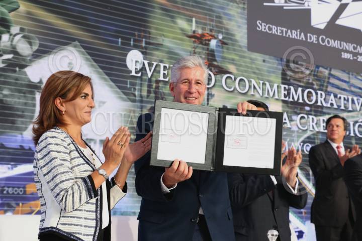 CIUDAD DE MÉXICO, 13MAYO2016.- Gerardo Ruiz Esparza, titular de la SCT acompañado de Elena Tanus, directora de Sepomex, durante la conmemoración del 125 aniversario de la creación de la SCT. FOTO: SAÚL LÓPEZ /CUARTOSCURO.COM