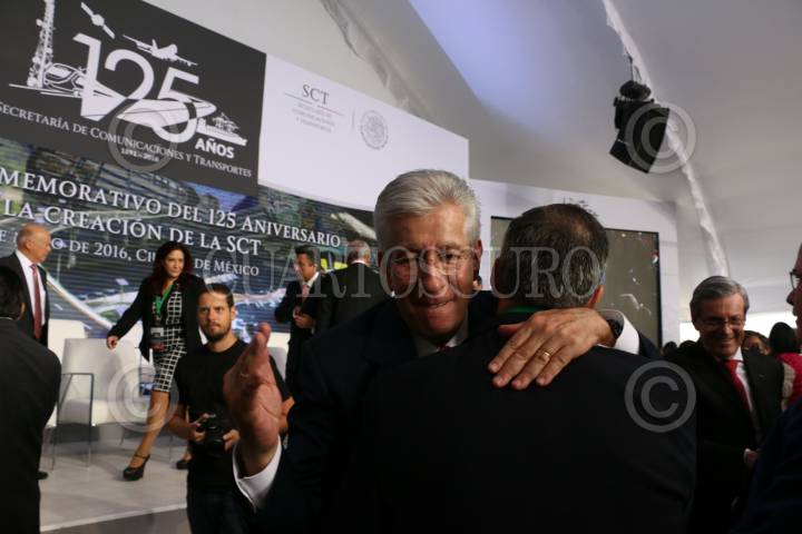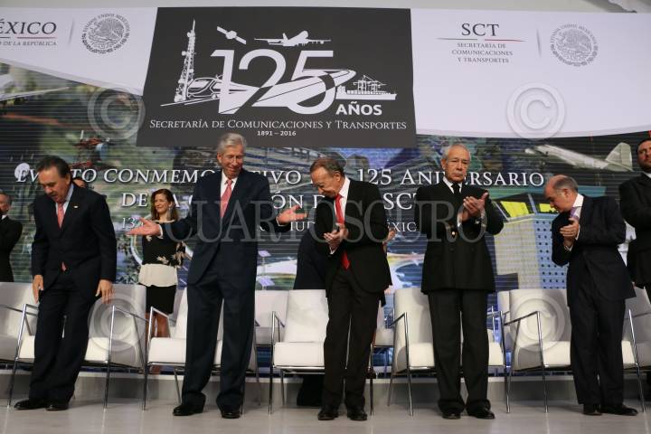 CIUDAD DE MÉXICO, 13MAYO2016.- Gerardo Ruiz Esparza, titular de la SCT, acompañado de los ex secretarios Daniel Díaz Díaz, Emilio Gamboa Patrón, Guillermo Ortiz, Pedro Cerisola y Luis Manuel Enrique Téllez Kuenzler durante la conmemoración del 125 aniversario de la creación de la SCT. FOTO: SAÚL LÓPEZ /CUARTOSCURO.COM