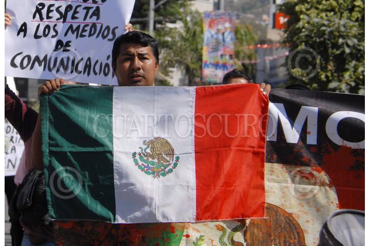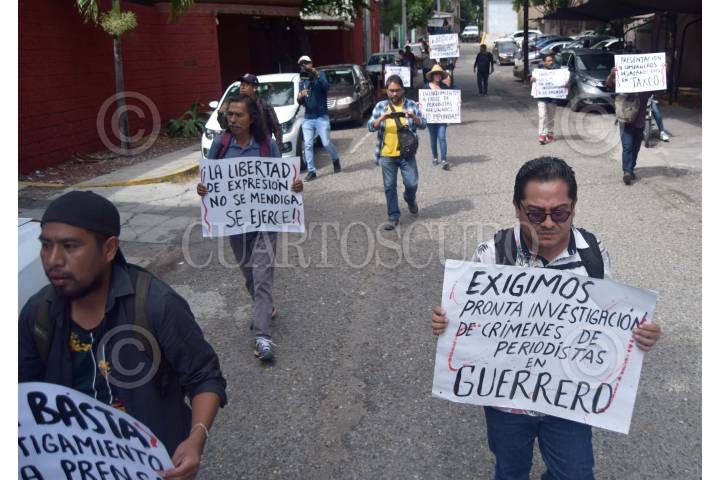 CHILPANCINGO, GUERRERO, 09ENERO2018.- Representantes de diversos medios de comunicación marcharon para exigir se castigue a los responsables de las agresión que sufrieron periodistas durante la cobertura del enfrentamiento entre la Policía Estatal y la Policía Comunitaria en el poblado de la Concepción, también se pidió justicia para el fotoperiodista Bernandino Hernández quien fue agredido por la policía estatal durante la cobertura. FOTO: CUARTOSCURO.COM