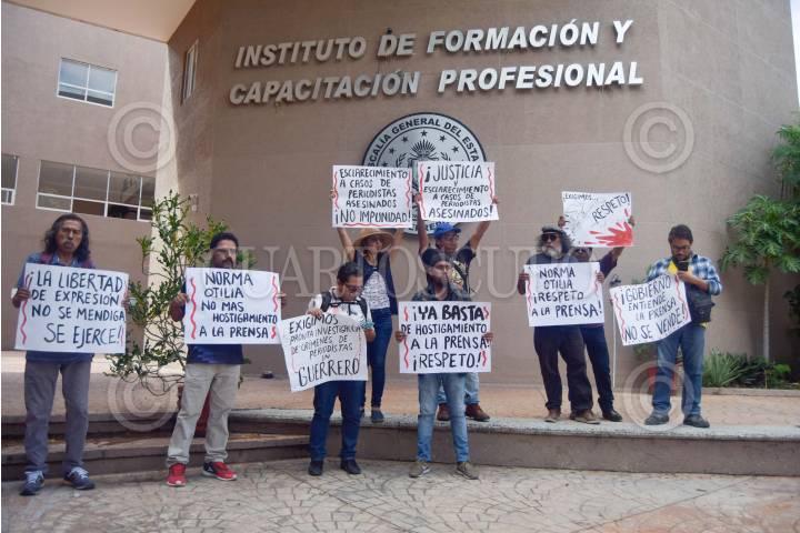 CHILPANCINGO, GUERRERO, 24NOVIEMBRE2023.- Representantes de los medios de comunicación del municipio de Chilpancingo se manifestaron en las instalaciones de la Fiscalía General del Estado (FGE) de Guerrero, para exigir la presentación con vida de tres comunicadores del municipio de Taxco de Alarcón y sus familias. Pasado el mediodía del viernes un trabajadores de los distintos medios de comunicación con pancartas en mano, para exigir la presentación con vida de Marco Antonio Toledo Jaimes quién es director del semanario El Espectador de Taxco y corresponsal de La Crónica, su esposa Guadalupe Denova Flores quién y su hijo de 28 años Alberto Toledo Denova.Además de el matrimonio Silvia Naisa Avilés y Alberto Sánchez quienes administran el portal de noticias RED-7.FOTO: DASSAEV TÉLLEZ ADAME/CUARTOSCURO.COM