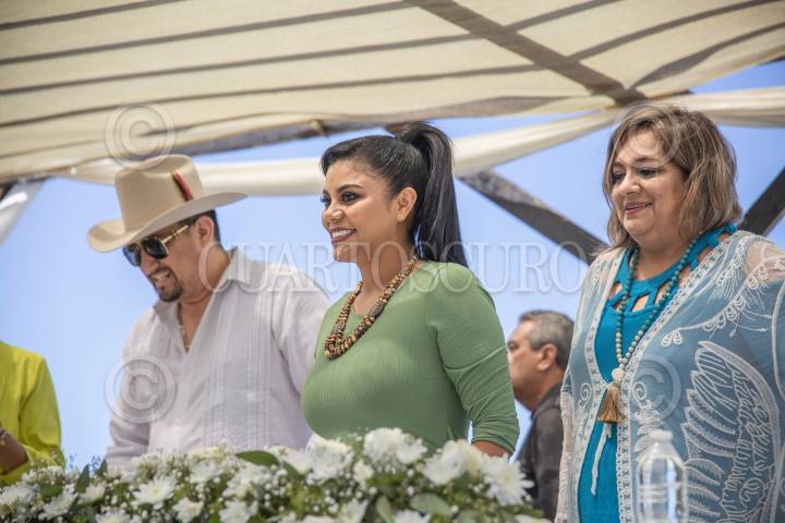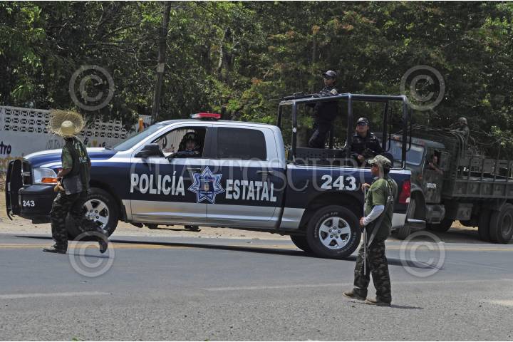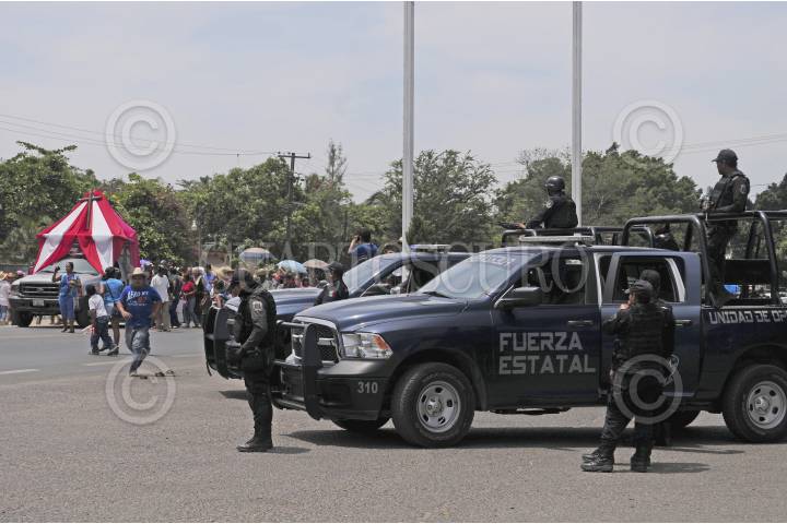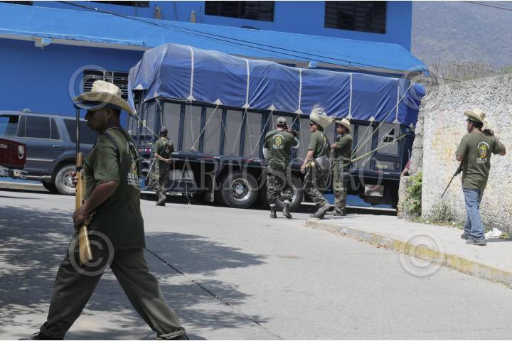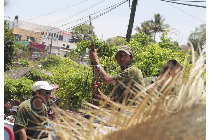 OCOTITO, GUERRERO, 02MAYO2014.- Se llevó acabo el Paseo del Pendón, a pesar de que un grupo de habitantes se oponía a que se realizara, esta mañana los habitantes salieron a las calle dando cumplimiento a la tradicional feria de la Santa Cruz, durante el Evento y después del evento, la policía federal, ejercito Mexicano, la policía estatal realizan vigilancia en esta comunidad, cabe mencionar que la policía comunitaria también brindo seguridad durante el paseo del pendón y a tres meses de su llegada, y hace dos semanas el grupo de comunitario enfrenta un conflicto interno, dividiéndolos en dos grupos, por lo que un grupo desconoce su líder y dirigente de la Unión de Pueblos y Organizaciones Sociales del Estado de Guerrero (UPOEG) Bruno Placido Valerio, inconformidad que se anuncia en dos mantas que están a la entrada del pueblo. FOTO: JOSE I. HERNÁNDEZ /CUARTOSCURO.COM