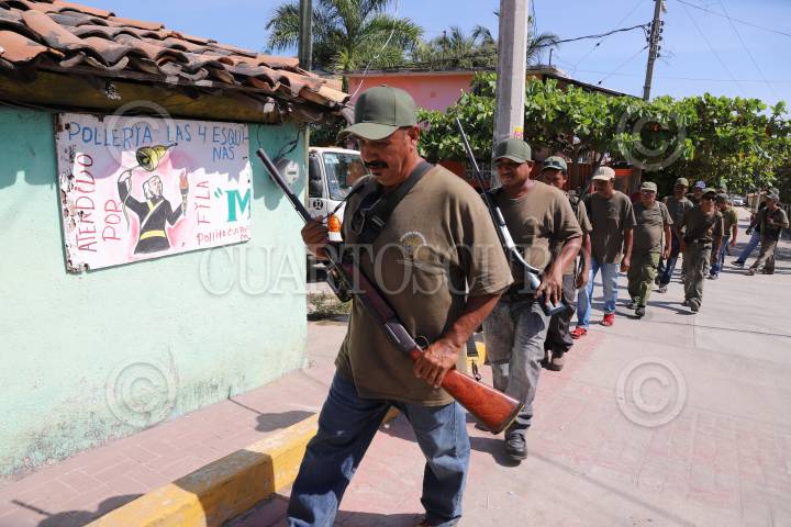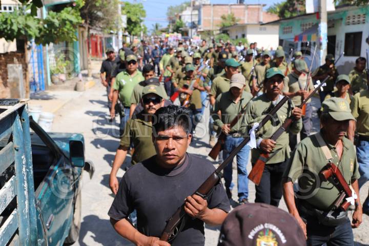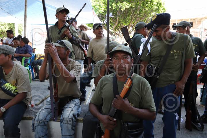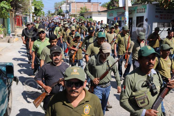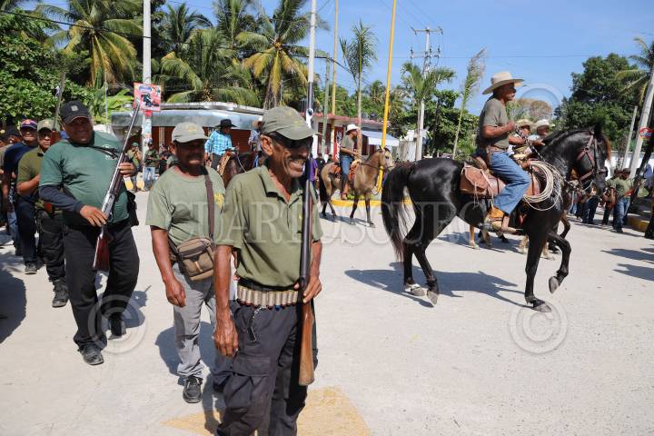 COPALA, GUERRERO, 05ENERO2019.- Más de un millar de comunitarios armados, incluyendo 50 a caballo, marcharon por las principales calles de esta cabecera municipal para exigir respeto a la libre autodeterminaciòn de los pueblos mestizos, indígenas y afro que, aseguran, han sido los olvidados de siempre. Al conmemorar el sexto aniversario del surgimiento del Sistema de Seguridad y Justicia Ciudadana (SSJC), popularmente conocidos como autodefensas, los militantes de la Unión de Pueblos y Organizaciones del Estado (UPOEG) acordaron fortalecer esta organización popular armada para defender a las comunidades del acoso de la delincuencia. Los policías comunitarios de la UPOEG, que en conjunto totalizan alrrededor de 7 mil 500 hombres, consideraron prioritario ampliar su presencia en otros municipios fuera de su área de influencia. FOTO: BERNANDINO HERNÁNDEZ /CUARTOSCURO.COM