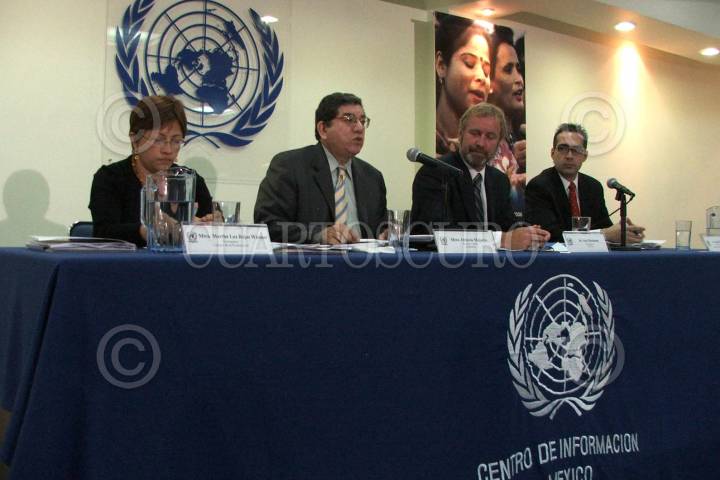 MÉXICO, D.F. 05SEPTIEMBRE2006.- El Fondo de Poblacion de la Organizacion de las Naciones Unidas (ONU) y el Consejo Nacional de Población (CONAPO) presentarón en las instalaciones de la ONU un informe sobre el Estado y Poblacion Mundial 2006, en la imagen se observa a Martha Luz Rojas Investigadora del colegio de la frontera sur, Octavio Mojarro Secretario General del Consejo Nacional de Población, Arie Hoekman Representante del Fondo de Población de las naciones unidas y Juan Miguel Diez Oficial nacional de infomación de la ONU. FOTO: SAUL LOPEZ ESCORCIA/CUARTOSCURO.COM