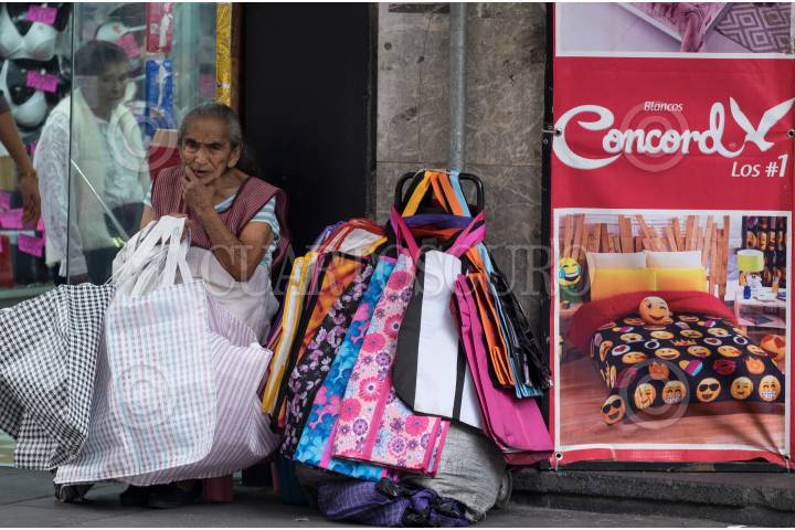 CIUDAD DE MÉXICO, 06JULIO2018.- Una mujer de la tercera edad vende bolsas para mandado en el Centro Histórico. En México el 16 por ciento de los adultos mayores sufre abandono y maltrato. De acuerdo con las proyecciones del Consejo Nacional de Población (CONAPO), en el país habitan casi 13 millones de personas mayores a los 60 años. FOTO: ANDREA MURCIA /CUARTOSCURO.COM