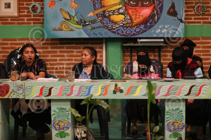 SAN CRISTOBAL DE LAS CASAS, 21ABRIL2018.- Mujeres zapatistas durante la sexta sesión de actividades en el conversatorio "Miradas, escuchas, palabras: ¿prohibido pensar?", encuentro entre el Concejo Indígena de Gobierno, las redes de apoyo del CIG, periodistas y artistas y el Ejército Zapatista de Liberación Nacional (EZLN) para hacer una evaluación sobre el recorrido y la participación del CIG y Marichuy como aspirante a candidata independiente. FOTO: DALIRI OROPEZA /CUARTOSCURO.COM