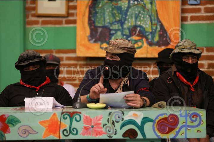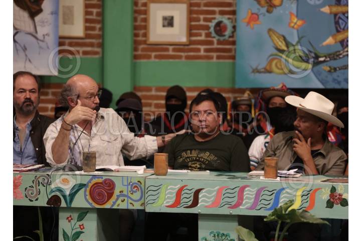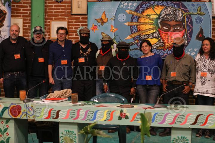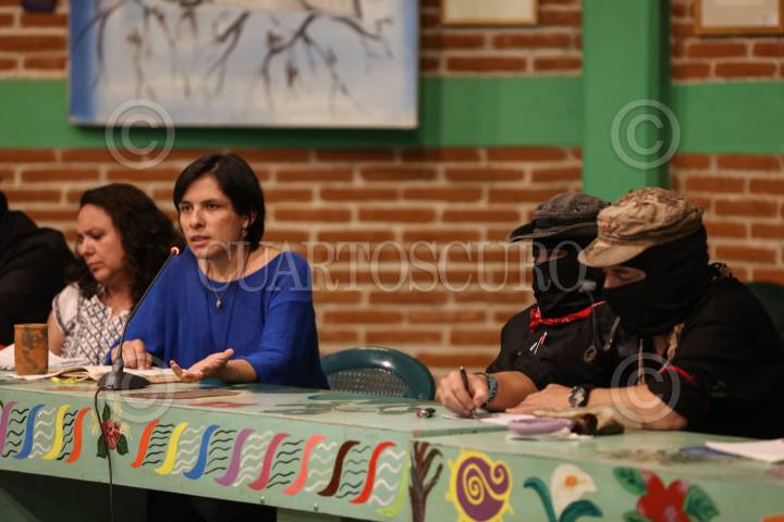 SAN CRISTOBAL DE LAS CASAS, 21ABRIL2018.- Luis Hernández Navarro, Emilio Lezama y Javier Risco, Subcomandante Galeano, Comandante Tacho, Subcomandante Moisés, Daniela Rea y Marcela Turati, durante la sexta sesión de actividades en el conversatorio "Miradas, escuchas, palabras: ¿prohibido pensar?", encuentro entre el Concejo Indígena de Gobierno, las redes de apoyo del CIG, periodistas y artistas y el Ejército Zapatista de Liberación Nacional (EZLN) para hacer una evaluación sobre el recorrido y la participación del CIG y Marichuy como aspirante a candidata independiente. FOTO: DALIRI OROPEZA /CUARTOSCURO.COM