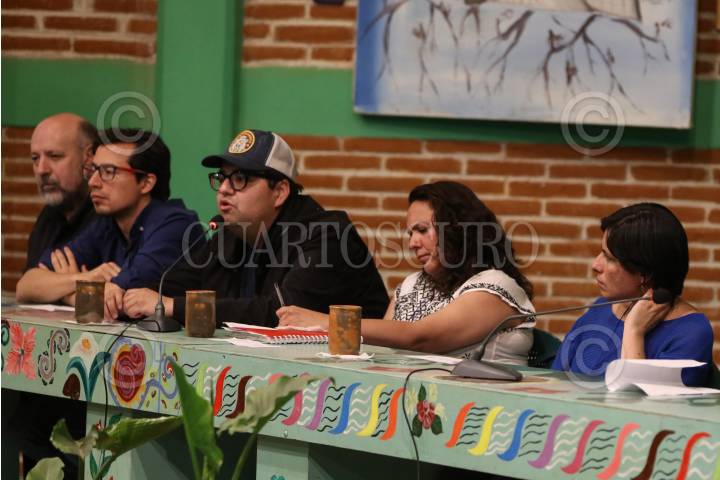 SAN CRISTOBAL DE LAS CASAS, 21ABRIL2018.- Luis Hernández Navarro, Emilio Lezama y Javier Risco, Marcela Turati y Daniela Rea, periodistas, durante la sexta sesión de actividades en el conversatorio "Miradas, escuchas, palabras: ¿prohibido pensar?", encuentro entre el Concejo Indígena de Gobierno, las redes de apoyo del CIG, periodistas y artistas y el Ejército Zapatista de Liberación Nacional (EZLN) para hacer una evaluación sobre el recorrido y la participación del CIG y Marichuy como aspirante a candidata independiente. FOTO: DALIRI OROPEZA /CUARTOSCURO.COM