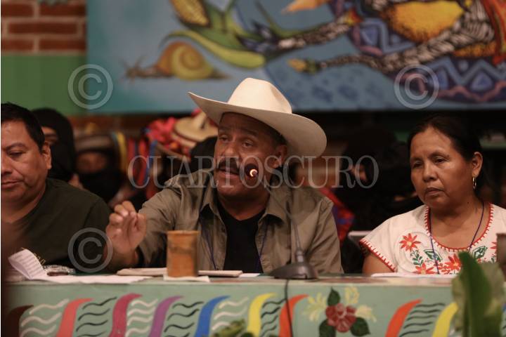 SAN CRISTOBAL DE LAS CASAS, 21ABRIL2018.- Mardonio Carvallo, escritor, Carlos González, concejal del CIG y María de Jesús Patricio Martínez (Marichuy), durante la séptima sesión de actividades en el conversatorio "Miradas, escuchas, palabras: ¿prohibido pensar?", encuentro entre el Concejo Indígena de Gobierno, las redes de apoyo del CIG, periodistas y artistas y el Ejército Zapatista de Liberación Nacional (EZLN) para hacer una evaluación sobre el recorrido y la participación del CIG y Marichuy como aspirante a candidata independiente. FOTO: DALIRI OROPEZA /CUARTOSCURO.COM