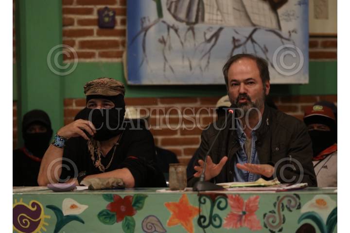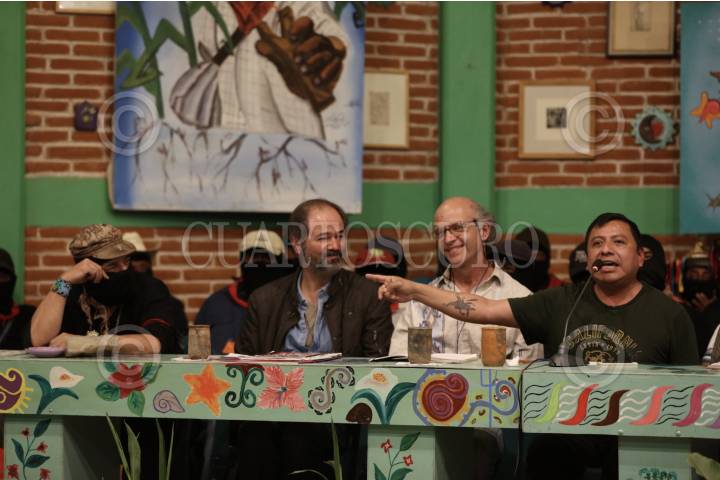 SAN CRISTOBAL DE LAS CASAS, 21ABRIL2018.- Subcomandante Galeano, Juan Villoro, periodista y escritor, Juan Carlos Rulfo, cineasta y Mardonio Carvallo, escritor, durante la séptima sesión de actividades en el conversatorio "Miradas, escuchas, palabras: ¿prohibido pensar?", encuentro entre el Concejo Indígena de Gobierno, las redes de apoyo del CIG, periodistas y artistas y el Ejército Zapatista de Liberación Nacional (EZLN) para hacer una evaluación sobre el recorrido y la participación del CIG y Marichuy como aspirante a candidata independiente. FOTO: DALIRI OROPEZA /CUARTOSCURO.COM