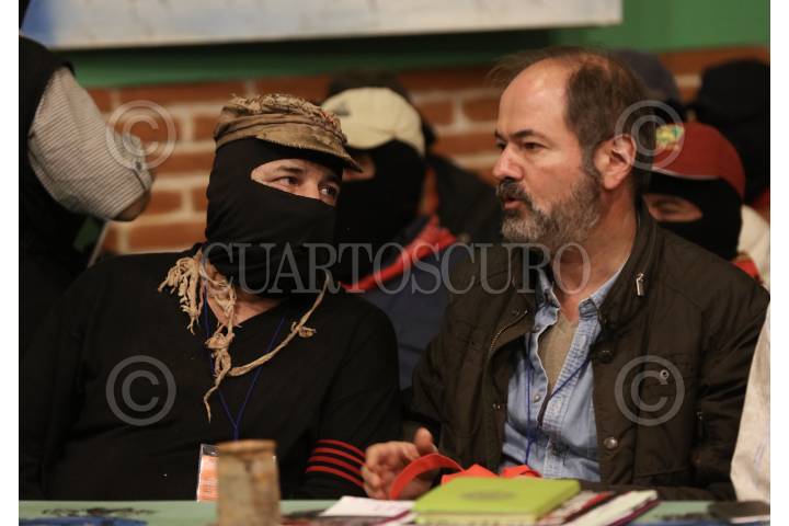SAN CRISTOBAL DE LAS CASAS, 21ABRIL2018.- Subcomandante Galeano y Juan Villoro, periodista y escritor, durante la séptima sesión de actividades en el conversatorio "Miradas, escuchas, palabras: ¿prohibido pensar?", encuentro entre el Concejo Indígena de Gobierno, las redes de apoyo del CIG, periodistas y artistas y el Ejército Zapatista de Liberación Nacional (EZLN) para hacer una evaluación sobre el recorrido y la participación del CIG y Marichuy como aspirante a candidata independiente. FOTO: DALIRI OROPEZA /CUARTOSCURO.COM