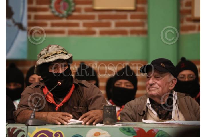 SAN CRISTOBAL DE LAS CASAS, 21ABRIL2018.- Juan Carlos Rulfo, cineasta, Mardonio Carvallo, escritor y Carlos González, concejal del CIG y esposo de Marichuy, Subcomandante Moisés, Comndante Tachó y Pablo González Casanova, sociólogo intelectual y ex rector de la UNAM, durante la séptima sesión de actividades en el conversatorio "Miradas, escuchas, palabras: ¿prohibido pensar?", encuentro entre el Concejo Indígena de Gobierno, las redes de apoyo del CIG, periodistas y artistas y el Ejército Zapatista de Liberación Nacional (EZLN) para hacer una evaluación sobre el recorrido y la participación del CIG y Marichuy como aspirante a candidata independiente. FOTO: DALIRI OROPEZA /CUARTOSCURO.COM