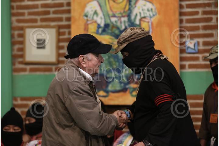 SAN CRISTOBAL DE LAS CASAS, 21ABRIL2018.- Comandante Tacho nombra a Don Pablo González Casanova como “Pablo Contreras” nuevo miembro miembro del Comité Clandestino Revolucionario Indígena-Comandancia General del EZLN, por su historia de lucha al lado del pueblo mexicano y su cercanía con los pueblos zapatistas, durante la séptima sesión de actividades en el conversatorio "Miradas, escuchas, palabras: ¿prohibido pensar?", encuentro entre el Concejo Indígena de Gobierno, las redes de apoyo del CIG, periodistas y artistas y el Ejército Zapatista de Liberación Nacional (EZLN) para hacer una evaluación sobre el recorrido y la participación del CIG y Marichuy como aspirante a candidata independiente. FOTO: DALIRI OROPEZA /CUARTOSCURO.COM
