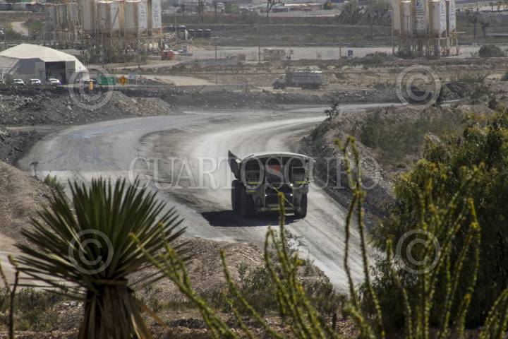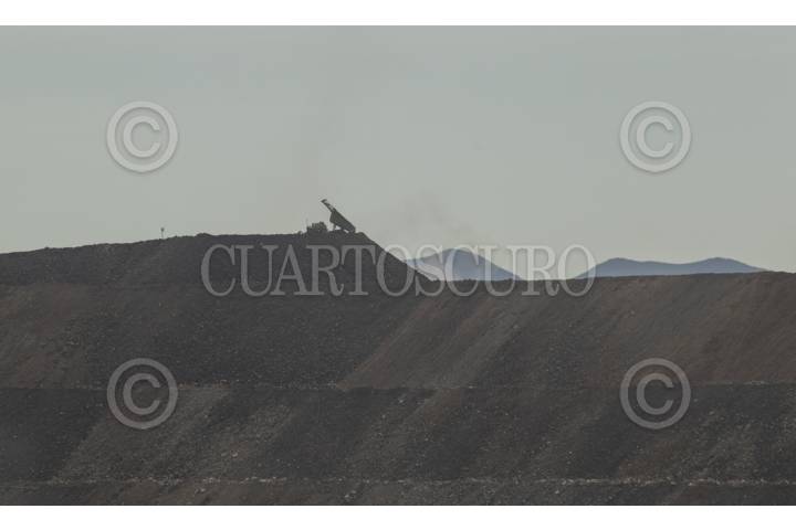 Camiones gigantes de la minera Peñasquito, descargan la tierra de desecho después de haber sido molida y así, extraído todos sus minerales. Mazapil, norte del estado de Zacatecas.