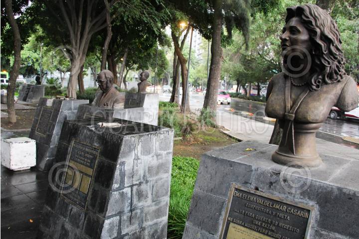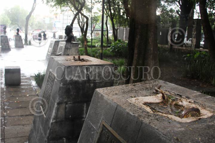 CIUDAD DE MÉXICO, 31AGOSTO2024.- En la Plaza de los Compositores, ubicada en la colonia Hipódromo Condesa de la Ciudad de México, siete de los 17 bustos de renombrados compositores mexicanos han desaparecido. Este espacio cultural, inaugurado en 2007, fue creado por la Sociedad de Autores y Compositores de México (SACM) para rendir homenaje a figuras icónicas como Consuelito Velázquez, Manuel Esperón, Gonzalo Curiel, Rocardo López Méndez y José Alfredo Jiménez. A pesar de su importancia, la plaza está descuidada. FOTO: GUSTAVO TORRES/CUARTOSCURO.COM
