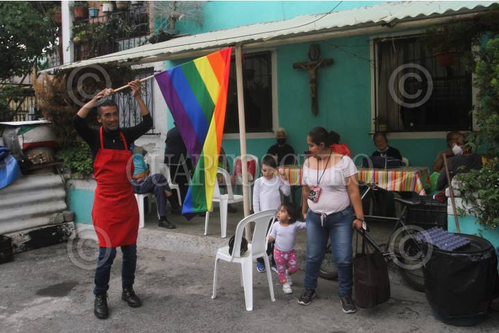 Canaria, mostró una bandera LGBT+ afuera del "Comedor Comunitario Condesa-Iztapalapa", ubicado en la colonia Vicente Guerrero, alcaldía Iztapalapa