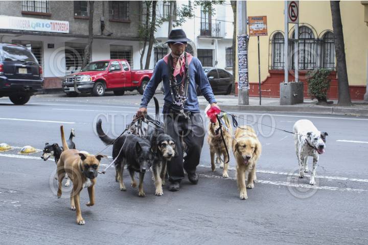 MÉXICO, D.F., 28ABRIL2015.- El oficio de paseador de perros cada día es más común en las zonas residenciales de la ciudad de México. Jóvenes se alquilan para sacar a pasear a sus perros, en algunas ocasiones llevan en sus manos hasta 12 perros de diferentes razas, todos sujetados firmemente con sus correas. FOTO: ISABEL MATEOS /CUARTOSCURO.COM