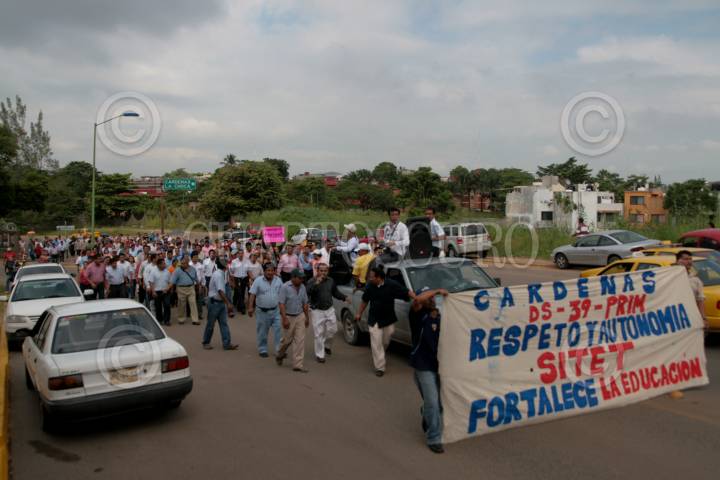 VILLAHERMOSA, TABASCO, 15OCTUBRE2010.- Cientos de educadores adheridos al Sindicato Independiente de Trabajadores de la Educación de Tabasco (SITET) realizaron una marcha por la avenida 27 de Febrero por donde se inconformaron por la falta de capacidad con que se conduce la secretaria de educación local. La marcha es encabezada por Roger Arias Garcia, dirigente del mencionado magisterio, quien realizo un plantón en el área central de la sede estatal de educación. FOTO: MARCO POLO GUZMÁN HERNÁNDEZ/CUARTOSCURO.COM