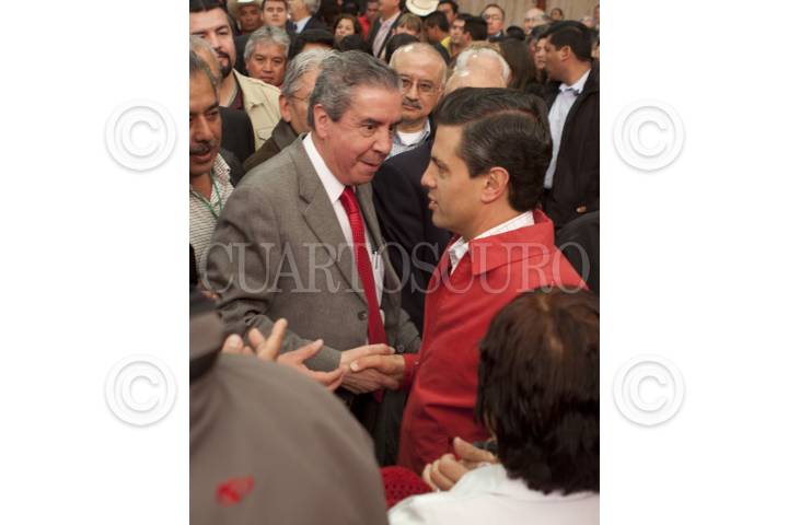 MÉXICO, D.F., 21DICIEMBRE2011.- Humberto Roque Villanueva, ex-dirigente del Partido Revolucionario Institucional (PRI), saluda a Enrique Peña Nieto, candidato a la presidencia de México por ese partido, al finalizar el desayuno con el sector campesino tricolor en las oficinas de la Confederación Nacional Campesina. FOTO: MOISÉS PABLO/CUARTOSCURO.COM
