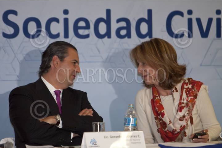 MÉXICO, D.F., 11ENERO2012.- Gerardo Gutiérrez Candiani, presidente nacional de la confederación Patronal de la República Mexicana (Coparmex) y María Elena Morera, presidenta de Causa en Común durante el panel Construcción de la Ciudadanía que se realizo como parte del Encuentro de la Sociedad Civil que realiza la Coparmex en el World Trade Center. FOTO: RODOLFO ANGULO/CUARTOSCURO.COM