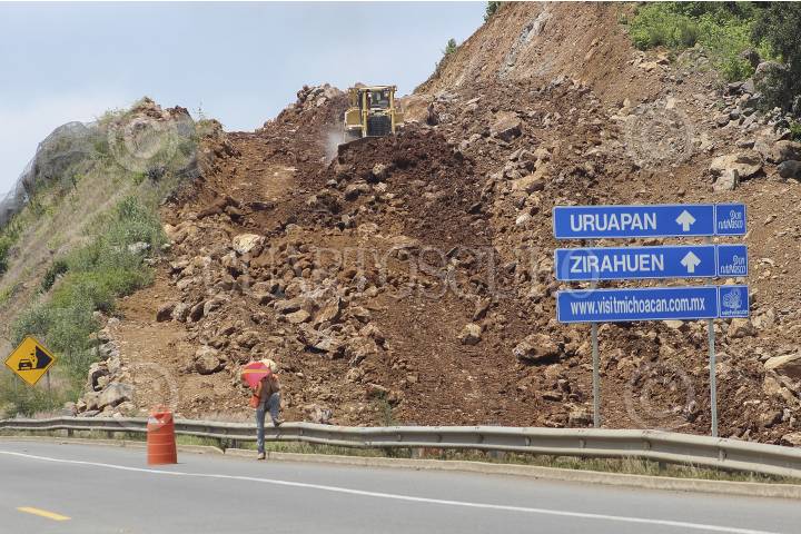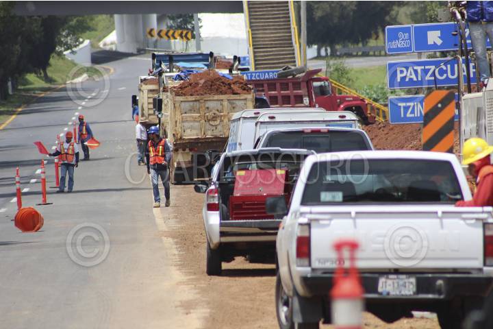 PATZCUARO, MICHOACÁN, 11AGOSTO2014. Transportistas de materiales pertenecientes de la Confederación de Trabajadores de México (CTM) bloquearon la carretera Morelia-Pátzcuaro, justo en la entrada de la obra Construcar que forma parte del proyecto Autopista de Michoacán, para exigir al gobierno del estado la misma oportunidad de trabajo que otros materialistas. FOTO: JUAN JOSÉ ESTRADA SERAFÍN /CUARTOSCURO.COM