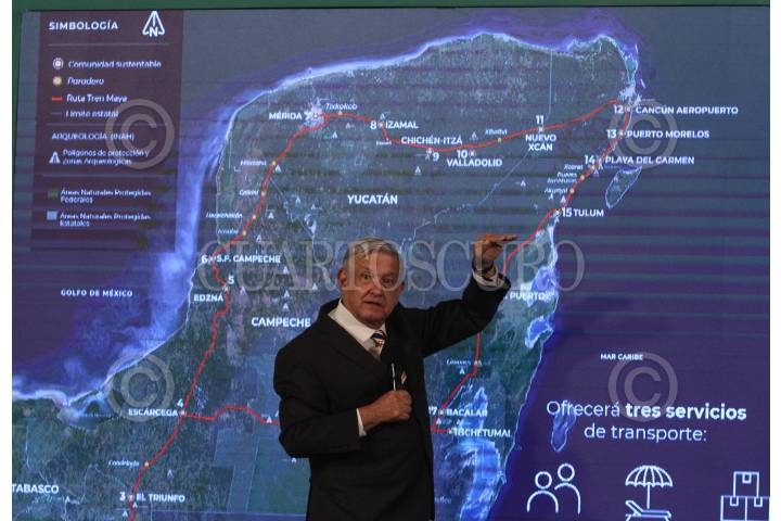 Andrés Manuel López Obrador, durante explicación sobre ruta del Tren Maya.