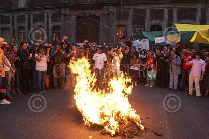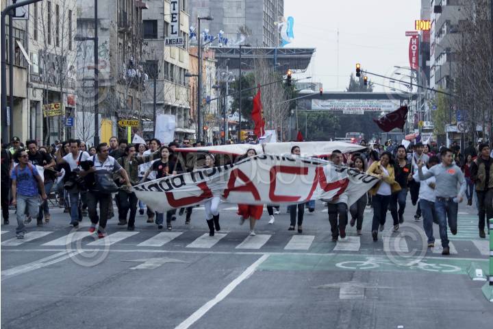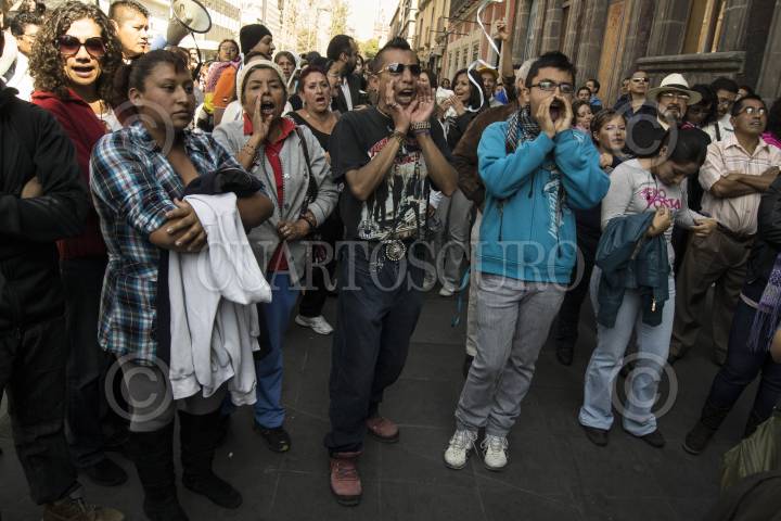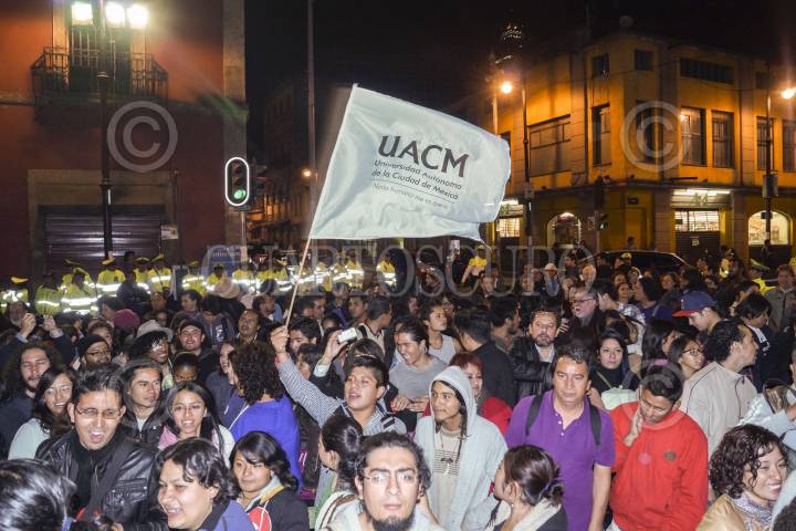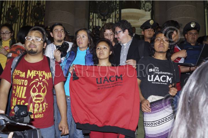 MÉXICO, D.F., 29NOVIEMBRE2012.- Estudiantes integrantes de Consejo Estudiantil en Lucha, que mantiene desde hace casi cien días una huelga por el respeto a las elección en la UACM, se manifiestan a las afueras del Museo de la Ciudad de México, durante el intento de la instalación del 3er Consejo Universitario de la UACM. Hasta las 20:00 hrs no había acuerdo entre los consejeros; los estudiantes cercanos a la rectora no firmaban la lista de asistencia que implicaba el cuorum para la instalación. FOTO: ADOLFO VLADIMIR /CUARTOSCURO.COM