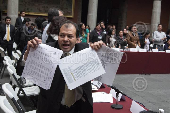 MÉXICO, D.F., 29NOVIEMBRE2012.- Carlos Eduardo Arriaga, abogado de la Universidad Autónoma de la Ciudad de México y cercano a la rectora Esther Orozco, presenta documentos donde presumiblemente impide la entrada a dos consejeros universitarios huelguistas; durante el intento de la instalación del 3er Consejo Universitario. Hasta las 20:00 hrs no había acuerdo entre los consejeros; los estudiantes cercanos a la rectora no firmaban la lista de asistencia que implicaba el cuorum para la instalación. FOTO: ADOLFO VLADIMIR /CUARTOSCURO.COM