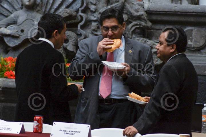 MÉXICO, D.F., 29NOVIEMBRE2012.- Juan José García Ochoa, subsecretario de Gobierno del DF; Raul González Placencia, presidente de la Comisión de Derechos Humanos del D.F.; y Eduardo Santillán Pérez, asambleísta del PRD en representación de la Asamblea Legislativa; comen una torta durante la larga espera para el inicio de la instalación del 3er Consejo Universitario. Hasta las 20:00 hrs no había acuerdo entre los consejeros; los estudiantes cercanos a la rectora no firmaban la lista de asistencia que implicaba el cuorum para la instalación. FOTO: ADOLFO VLADIMIR /CUARTOSCURO.COM