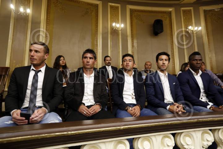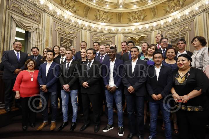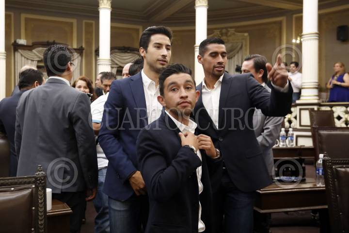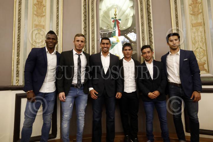 PUEBLA, PUEBLA, 27JULIO2016.- Christian "El Hobbit" Bermúdez, Eduardo Pérez, Francisco Arizala, Patricio Araujo y Matías Alustiza, jugadores del Club Puebla acompañados por Roberto Ruíz Esparza, titular del Instituto Poblano del Deporte y Carlos Poblete; asistieron al congreso del estado donde se aprobó la iniciativa de ley sobre la penalización por violencia en estadios de fútbol. FOTO: HILDA RÍOS/ CUARTOSCURO.COM