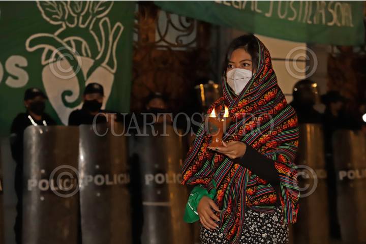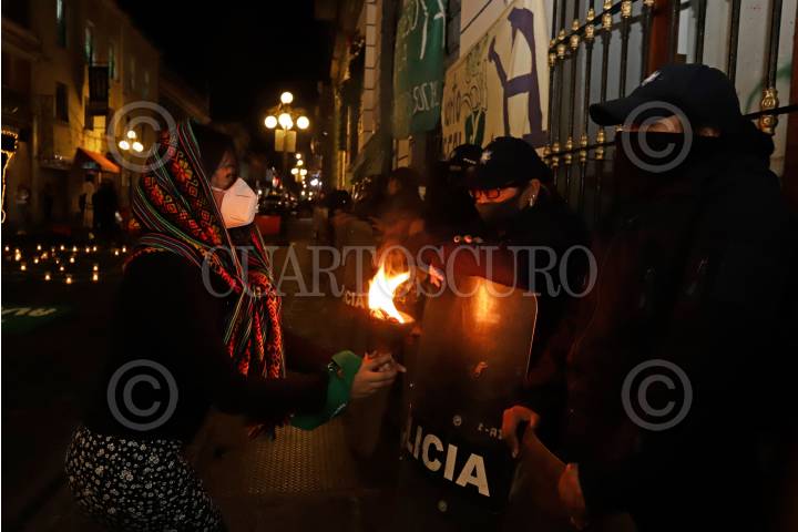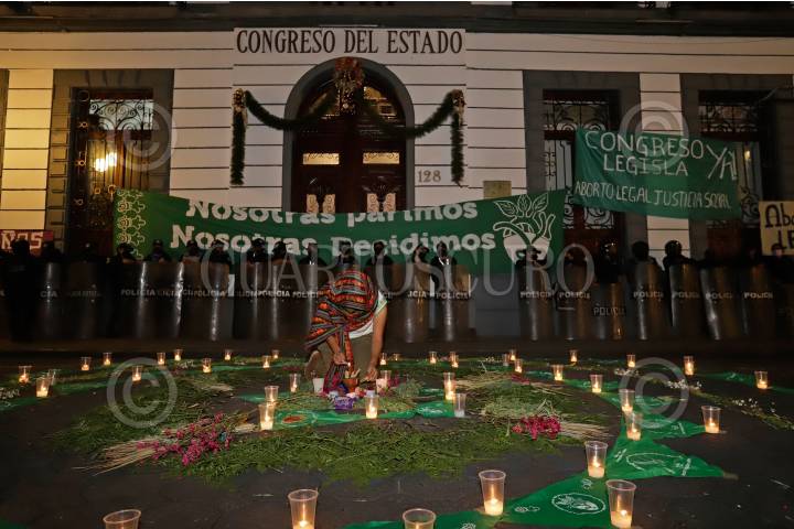 Colectivas feministas realizaron un altar en las puertas del Congreso de Estado de Puebla para exigir la despenalización del aborto.