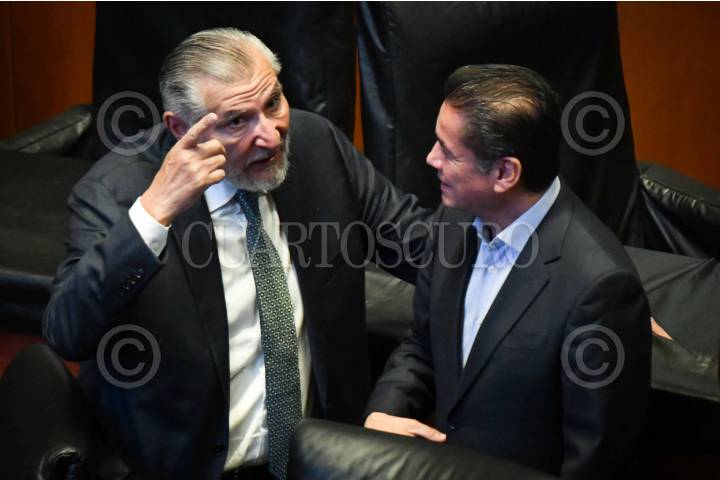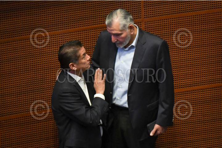 CIUDAD DE MÉXICO, 03JULIO2025.- Leonel Godoy, diputado de Morena, junto a Adán Augusto López, senador y coordinador de Morena, durante la sesión de la Comisión Permanente en la que se realizaron la presentación de iniciativas por parte de los grupos parlamentarios. FOTO: MARIO JASSO/CUARTOSCURO.COM