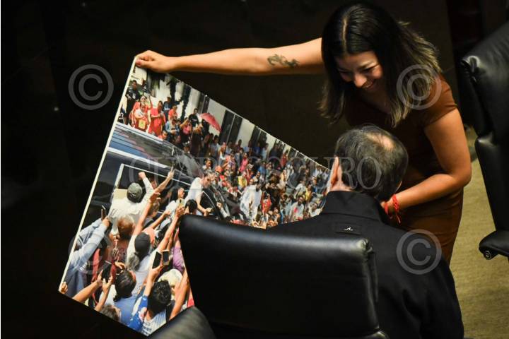 CIUDAD DE MÉXICO, 09JULIO2025.- Una asesora muestra a Gerardo Fernández Noroña, presidente de la mesa directiva, una fotografía de Claudia Sheinbaum, presidenta de México, en una gira de trabajo, mientras se desarrolla la sesión de la Comisión Permanente en la que se realizó la discusión de la agenda política en materia de seguridad. FOTO: MARIO JASSO/CUARTOSCURO.COM