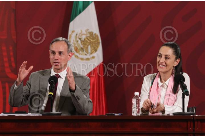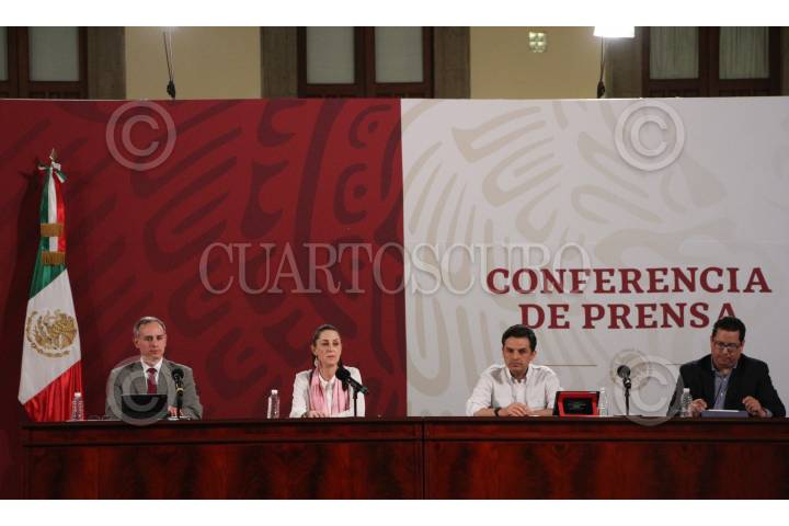Autoridades del sector salud y la jefa de gobierno durante la conferencia sobre el COVID-19 en Palacio Nacional.