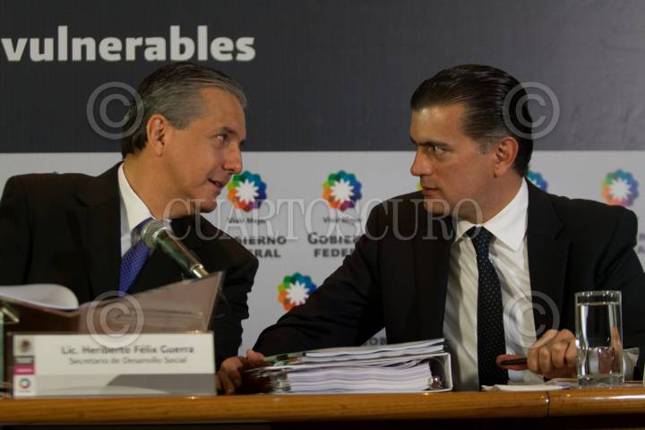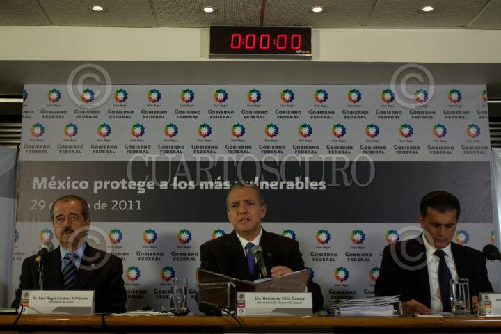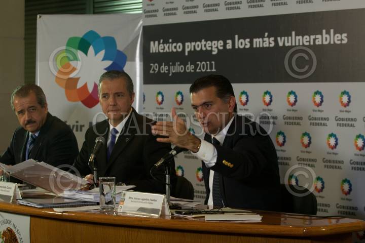 MÉXICO D.F., 29JULIO2011.- José Ángel Córdoba, Secretario de Salud, Heriberto Félix Guerra, Secretario de Desarrollo Social y Alonso Lujambio, titular de la Secretaria de Educación Publica, durante la conferencia respondieron al informe del Consejo Nacional de Evaluación de la Política de Desarrollo Social (CONEVAL) donde señalaron que del 2008 al 2010 hay 3.2 millones mas de pobres, para un total de 52 millones en el país. FOTO: GUILLERMO PEREA/CURTOSCURO.COM