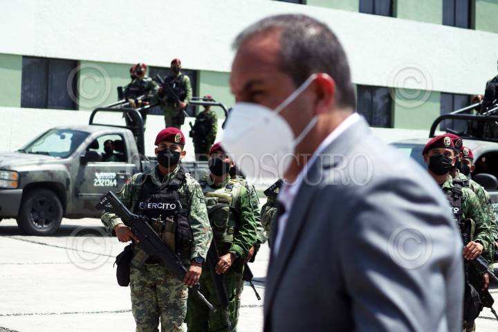 Cuauhtemoc Blanco, en primer plano desenfocado, camina para atender a la prensa local al finalizar un evento en la zona militar de la capital.
