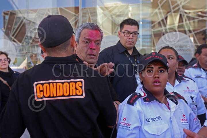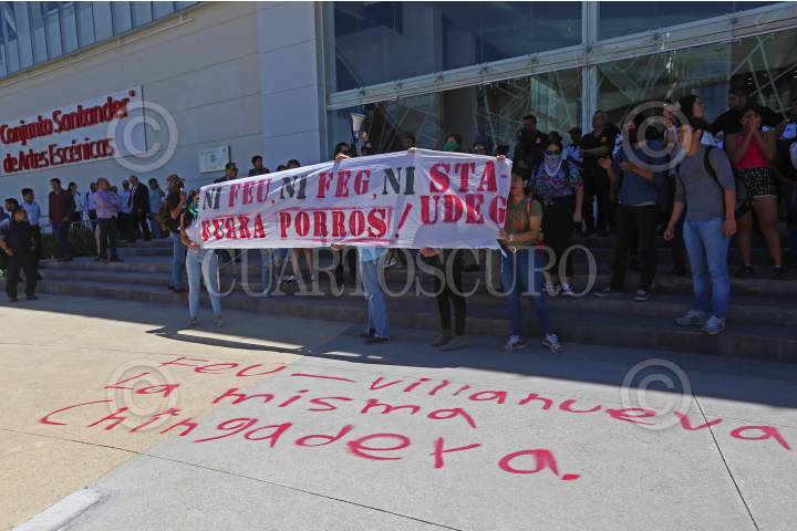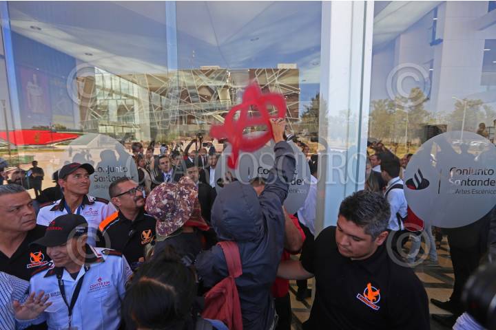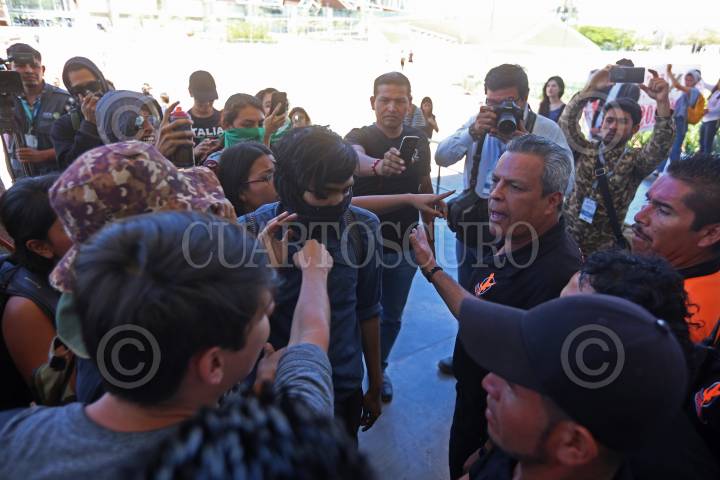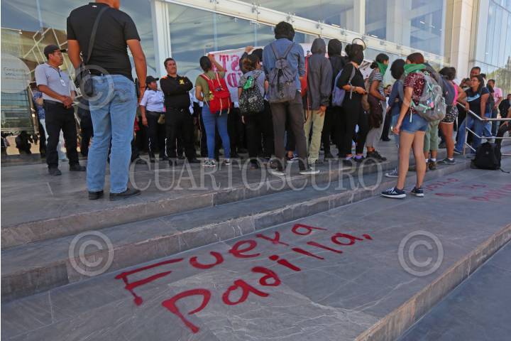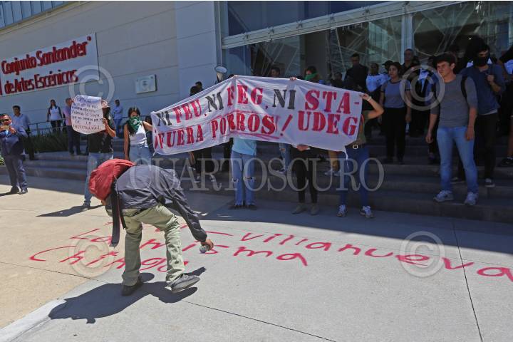 ZAPOPAN, JALISCO, 01ABRIL2019.- Estudiantes del Centro Universitario de Ciencias Sociales y Humanidades (CUCSH) de la Universidad de Guadalajara, se manifestaron a las afueras del Conjunto de Artes Escénicas ya casi al finalizar la toma de protesta del nuevo rector de la Universidad de Guadalajara Ricardo Villanueva, esto para inconformarse en contra de algunos directivos realizando pintas como “Fuera Padilla”, Muerte a los Porros” “FEU-Villanueva la misma Chingadera”, durante la controversia alumnos y elementos de seguridad privada del conjunto intercambiaron palabras y empujones entre otras agresiones. FOTO: FERNANDO CARRANZA GARCIA / CUARTOSCURO.COM