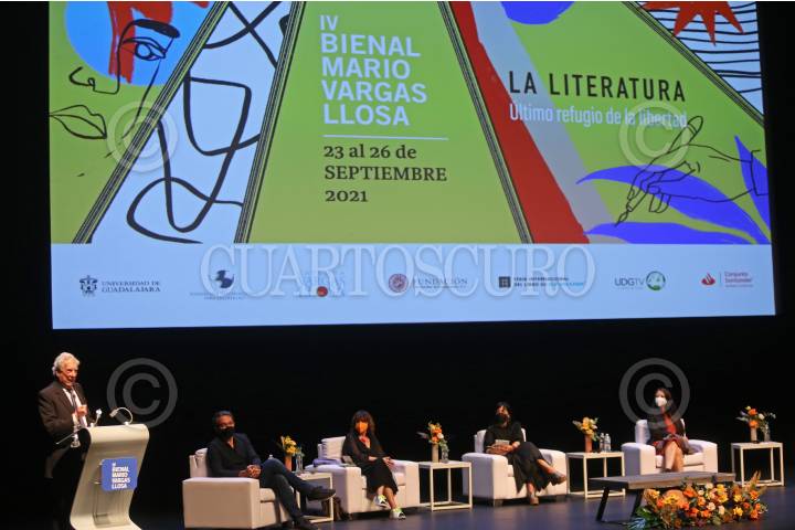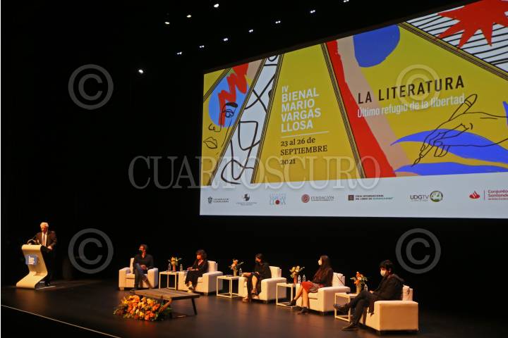 Mario Vargas Llosa escritor Peruano, durante si intervención en la ceremonia de inauguración de la IV Bienal que lleva su nombre y lo acompañan los finalistas de la Bienal que se celebra.