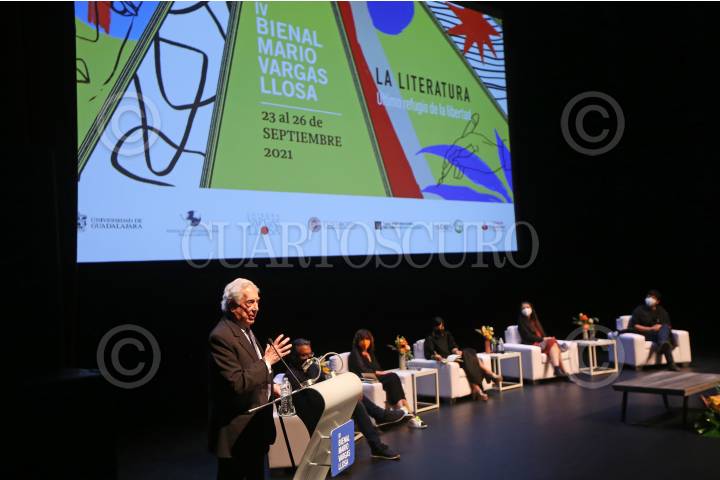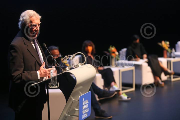 Mario Vargas Llosa escritor Peruano, durante si intervención en la ceremonia de inauguración de la IV Bienal que lleva su nombre.