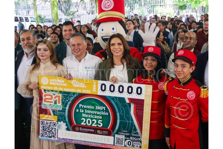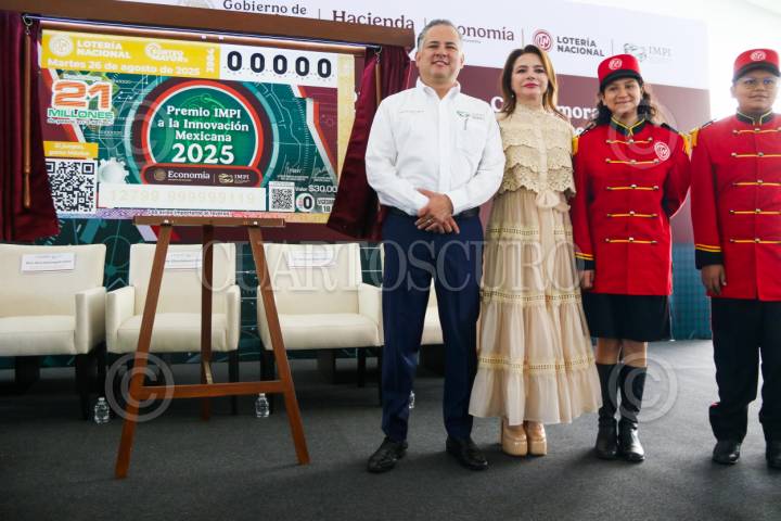 CIUDAD DE MÉXICO. 15AGOSTO2025.- La Lotería Nacional, encabezó la develación del billete de Sorteo Mayor 3984 correspondiente al Premio IMPI a la innovación mexicana 2025, asistieron Santiago Nieto y Olivia Salomón, en las oficinas IMPI. FOTO: VICTORIA VALTIERRA/CUARTOSCURO.COM