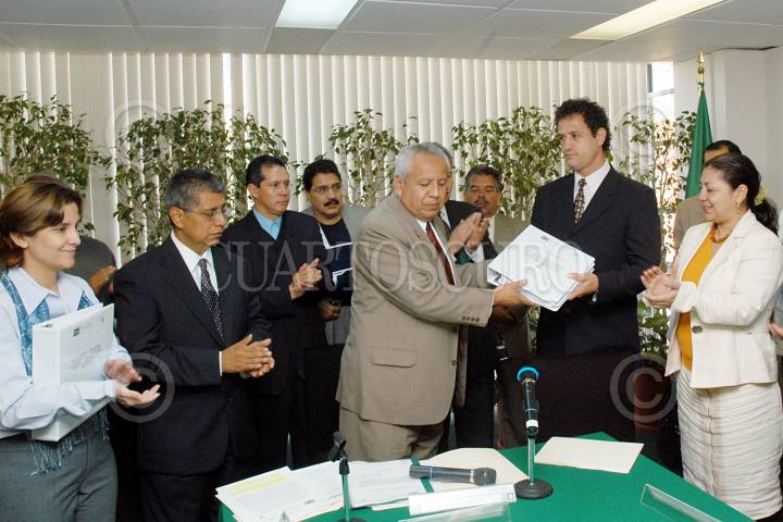 MEXICO, D.F. 14JUNIO2005.- El secretario de transporte y vialidad del Distrito Federal Francisco Garduño Yañez entrega la concesión de la linea del Metrobús a Jesús Padilla Zenteno presidente del consejo de administración de CISA, compañia que operará el servcicio del nuevo transporte público en la avenida Insurgentes. FOTO: Miguel Dimayuga/CUARTOSCURO.COM