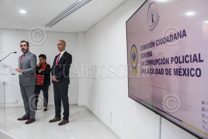 CIUDAD DE MÉXICO, 11JULIO2019.- La Fiscal Ernestina Godoy, Jesús Ortá, de la SSC y Salvador Guerrero Chiprés, en la conferencia de prensa, donde anunciaron la creación de la Comisión Ciudadana Contra la Corrupción Policial en la Ciudad de México. FOTO: VICTORIA VALTIERRA /CUARTOSCURO.COM