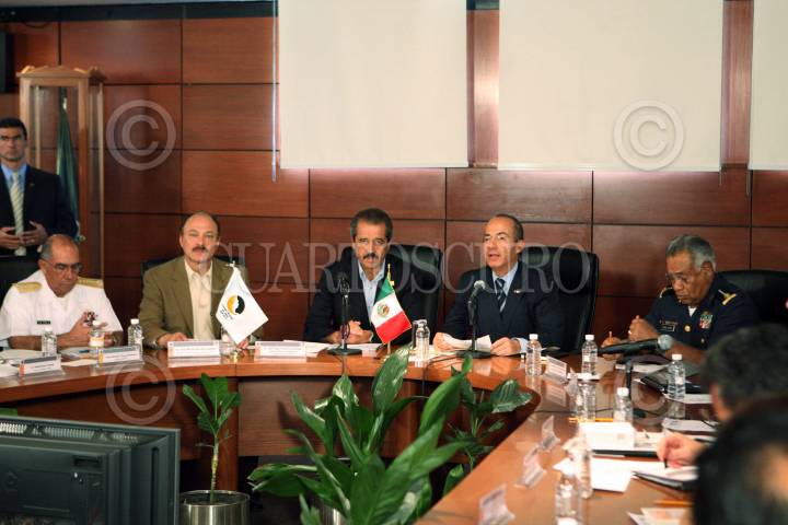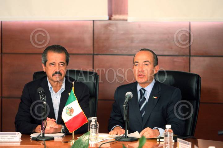 MEXICO D.F. 26ABRIL2009.- El presidente Felipe Calderón acompañado del secretario de salud José Ángel Cordoba Villalobos, durante la reunión con el Consejo Nacional de Salubridad General que se realizo en la Sala del Consejo. FOTO: FRANCISCO SANTOS/CUARTOSCURO.COM
