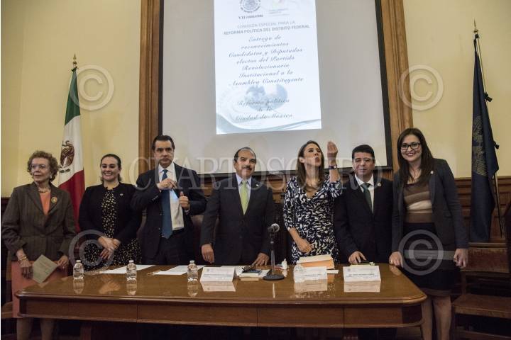 CIUDAD DE MÉXICO, 16FEBRERO2017.- José Encarnación Alfaro Cázares, Presidente de la Comisión Especial para la Reforma Política del Distrito Federal, Mariana Moguel Robles, diputada del grupo parlamentario del PRI, e Israel Betanzos Cortés, diputado miembro de la Comisión, encabezaron la entrega de reconocimientos a Candidatos y Diputados electos del Partido Revolucionario Institucional a la Asamblea Constituyente. FOTO: TERCERO DÍAZ /CUARTOSCURO.COM